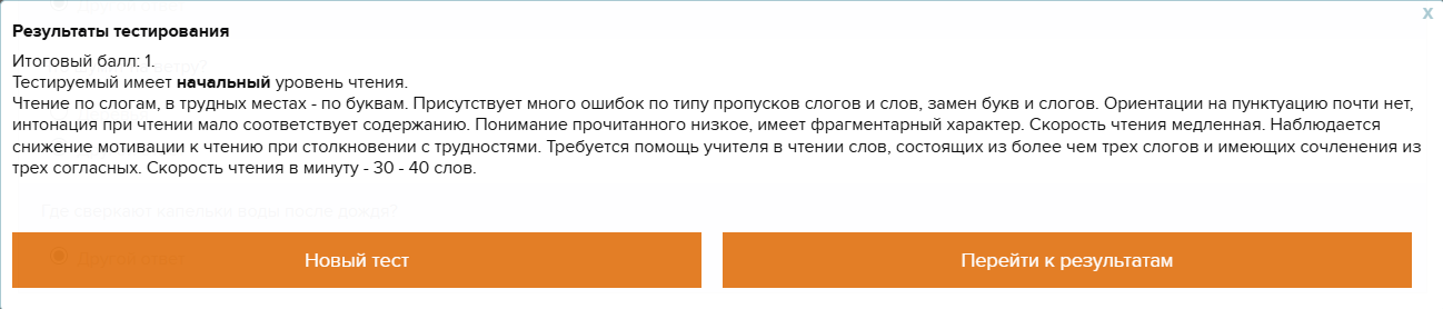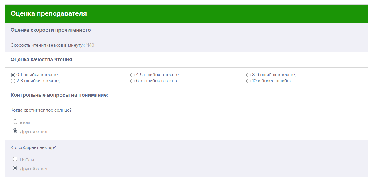 После прохождения тестирование преподаватель или родитель может заполнить онлайн анкету. В ней предложены вопросы для тестируемого. Ответы на эти вопросы помогут определить читательские компетенции.