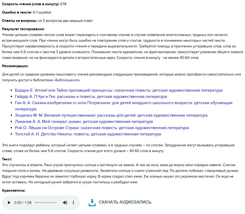 Все ваши результаты будут храниться в зоне “Результаты тестирования учащихся”. Тут вы найдете расшифровки тестов, сможете скачать или послушать аудиозапись, получить рекомендации по подбору литературы для конкретного уровня чтения.